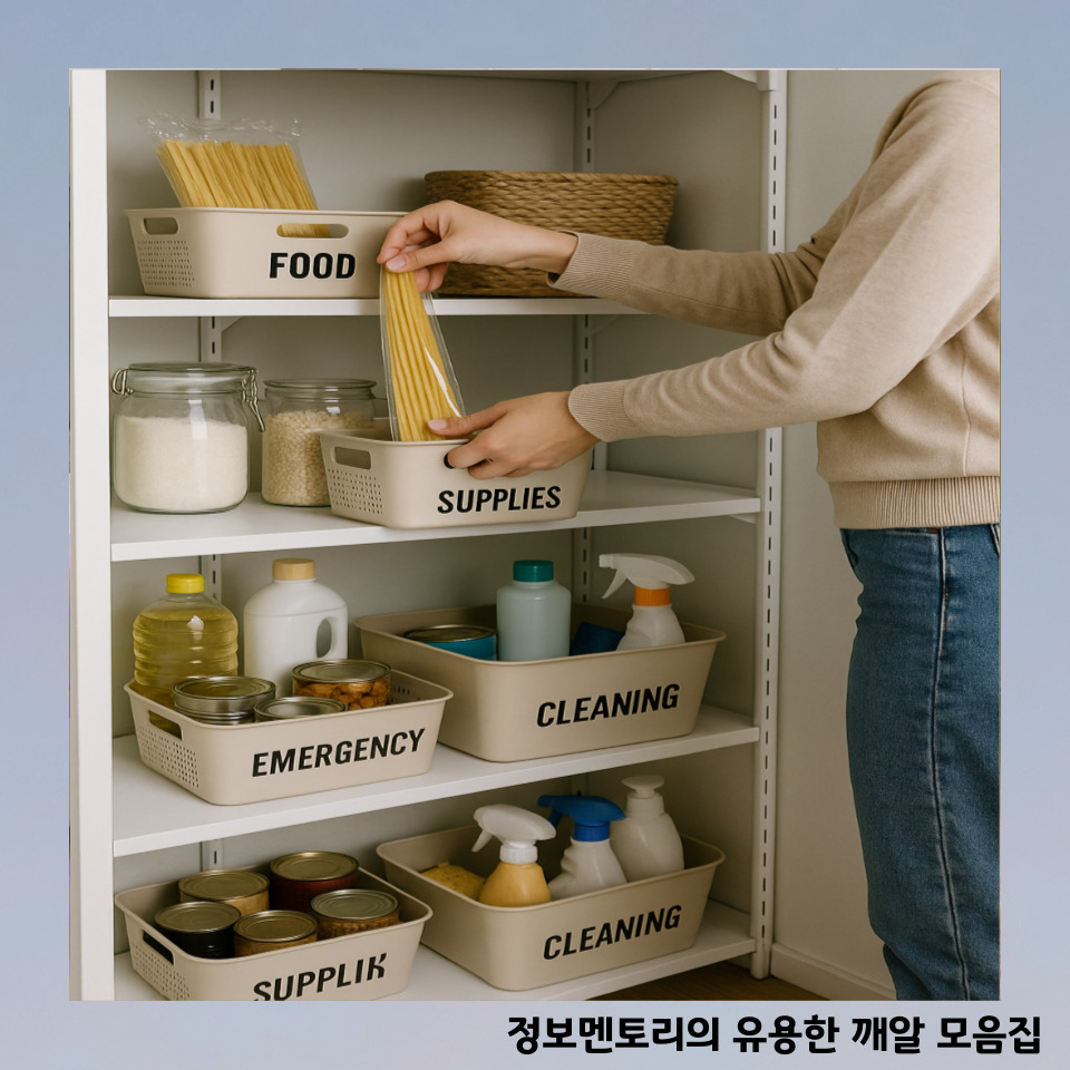 👉 저는 눈높이 선반엔 자주 쓰는 식자재, 발 아래엔 생수나 세제류, 위쪽엔 비상용품을 두고 있어요.