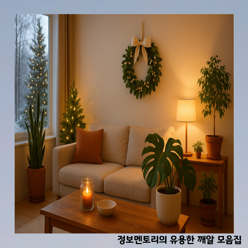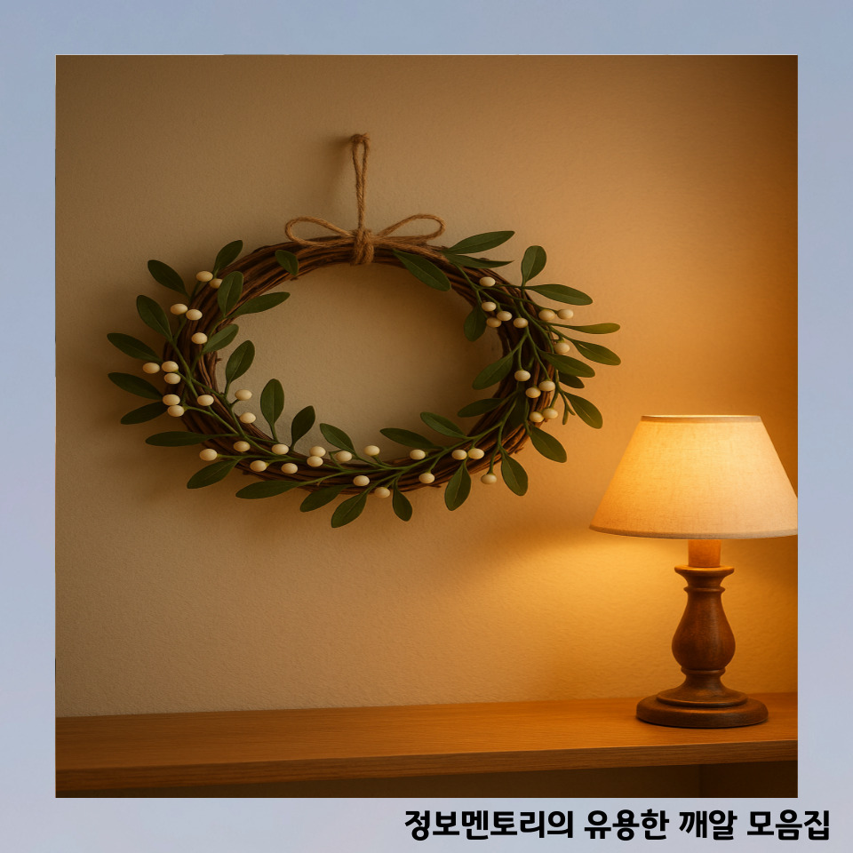 👉 저는 겨우살이 리스를 캔들 옆에 두었더니 그림자까지 따뜻한 분위기를 만들어줬어요