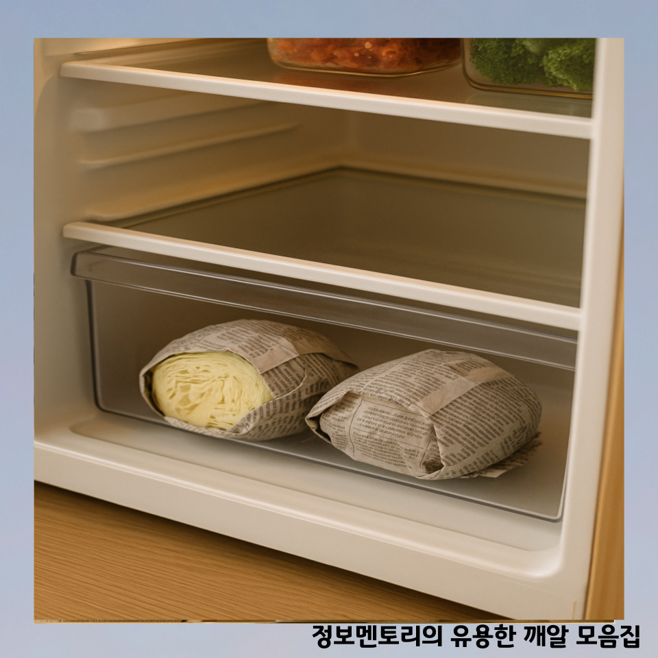 신문지가 냉장고 속 습기를 흡수하고 양배추 표면의 수분을 적당히 유지해줘요.