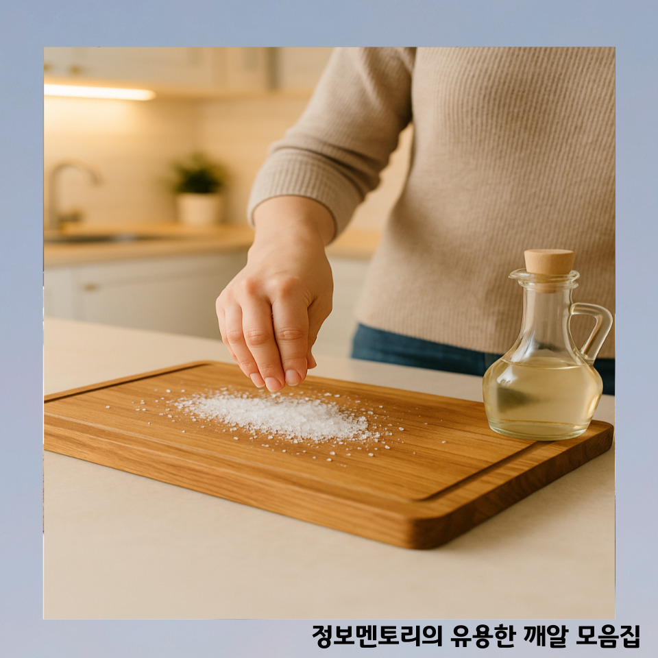 소금 입자가 도마 틈새의 냄새 입자를 흡수하고 식초가 살균 작용을 해 세균까지 제거해줍니다.